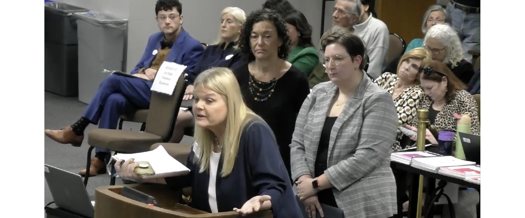 The board chair, Aaron Kinsey, responded, “Yes. So I do have that one up and so it is 2.10 A3— ‘the presiding chair will take appropriate action to avoid unduly repetitious testimony.’” Kinsey then said to the packed room, “I would like to encourage testifiers to bring unique perspectives as much as possible. … The board chair will do the best he can to keep us from being repetitious.”