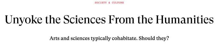 The author of the article below kindly sent me a copy of his piece calling for separation of humanities instruction from that of science. Such a tactic would even produce universities that taught one or the other but not both. The end result would be the death of universities offering a liberal education, and probably of humanities instruction as well.