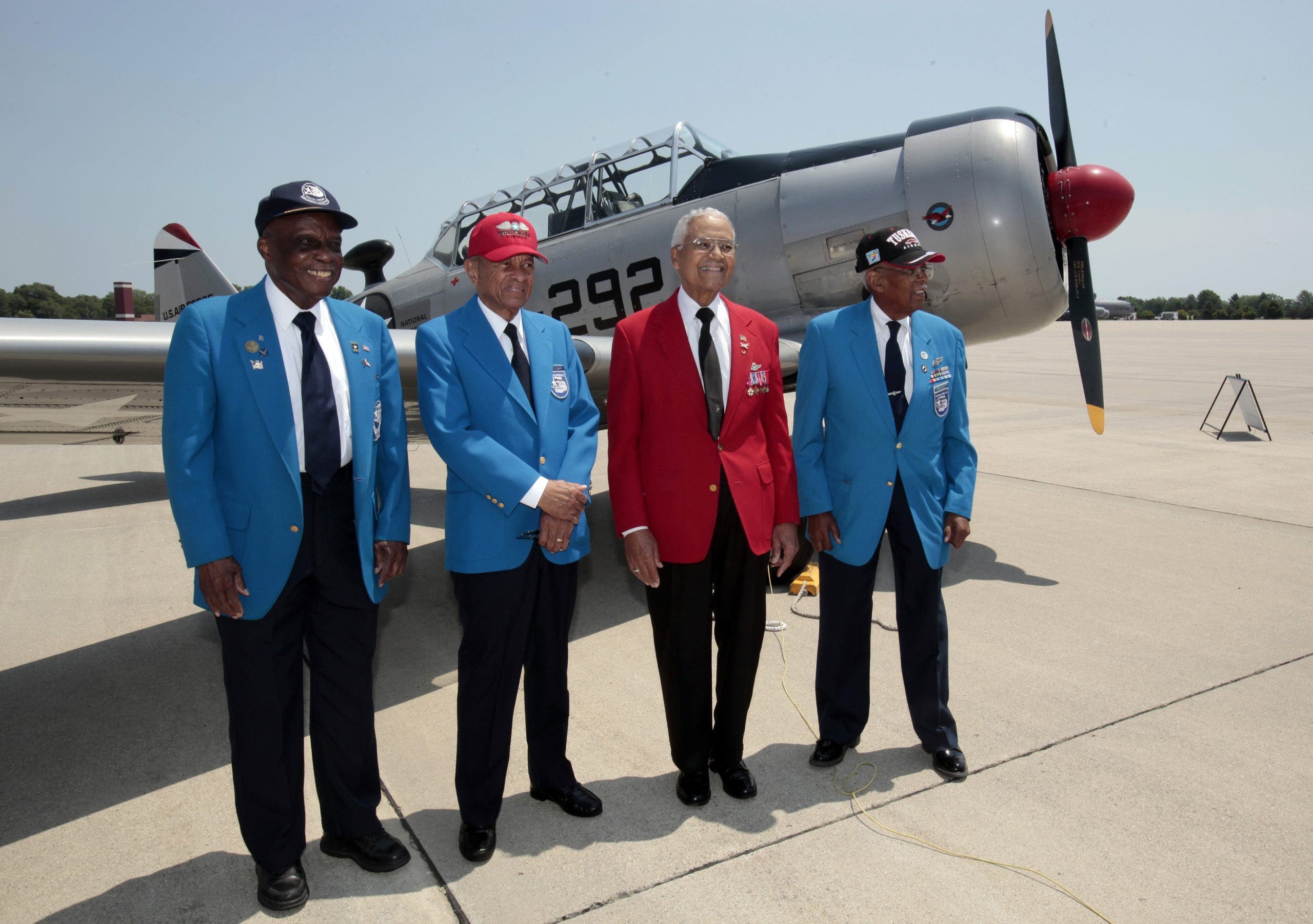 From left to right, Tuskegee Airmen pilots Lt. Colonel Washington Ross, Lt. Col. Harry Stewart, Colonel Charles McGee and Lt. Col. Alexander Jefferson stand next to a Tuskegee Army Airfield AY-6 Texan fighter plane during a ceremony to honor the airmen at Selfridge National Airbase in Harrison Township, Michigan, on June 19, 2012.
