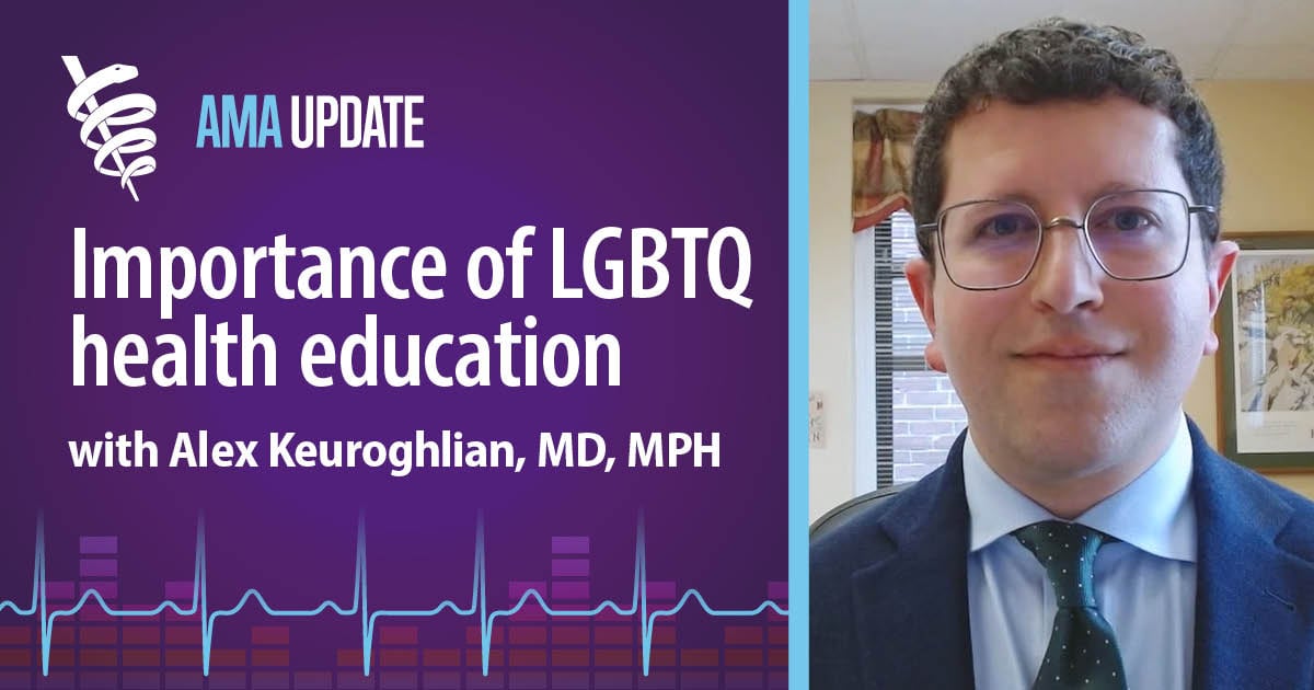Unger: Hello, and welcome to the AMA Update video and podcast. To close out Pride Month, today, we’re talking with Dr. Alex Keuroghlian, one of the winners of the Excellence in LGBTQ Health Awards from the AM Foundation. Dr. Keuroghlian is the chief of MaineHealth Behavioral Health and chair of the Department of Psychiatry at MaineHealth Maine Medical Center in Portland, Maine. I’m Todd Unger, AMA’s chief experience officer in Chicago. Dr. Keuroghlian, welcome, and congratulations on your award.