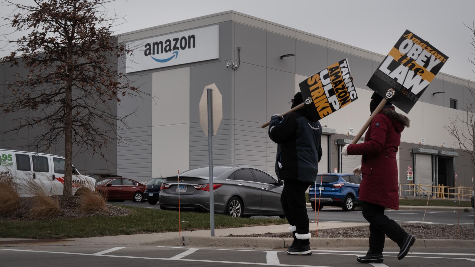 Workers picket in front of an Amazon Logistic Station on December 19, 2024 in Skokie Illinois.