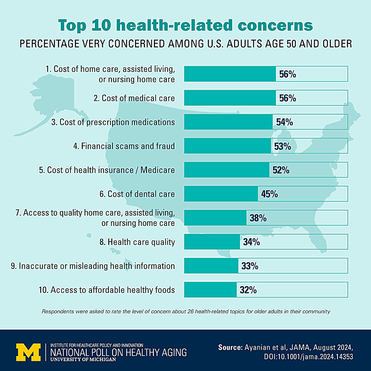 Published in JAMA by a team from the University of Michigan’s Institute for Healthcare Policy and Innovation, the study is based on data from the National Poll on Healthy Aging. The poll, conducted in February and March 2024, asked more than 2,500 adults ages 50 and older nationwide how concerned they were about 26 different health-related topics for older adults in their community, not just for themselves.