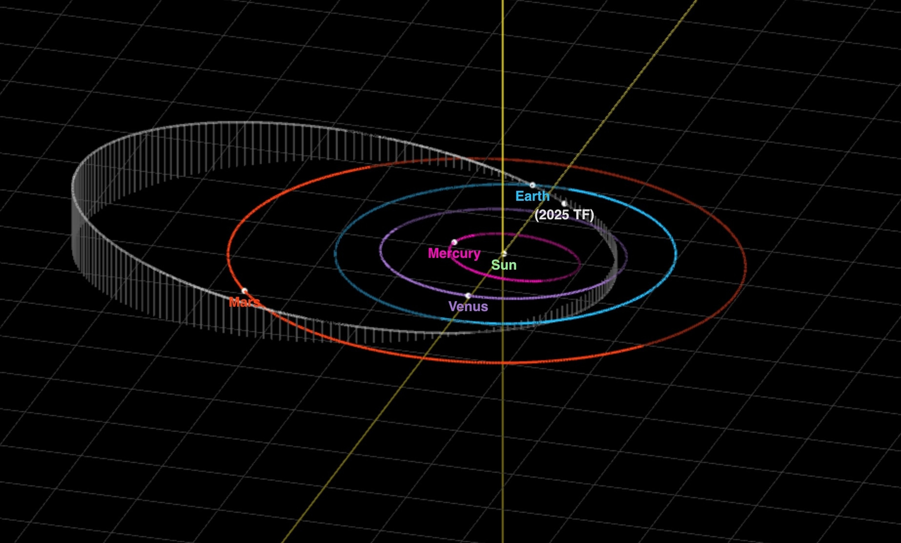 In this screen grab from a video, the orbit of 2025 TF is shown close to Earth’s orbit.