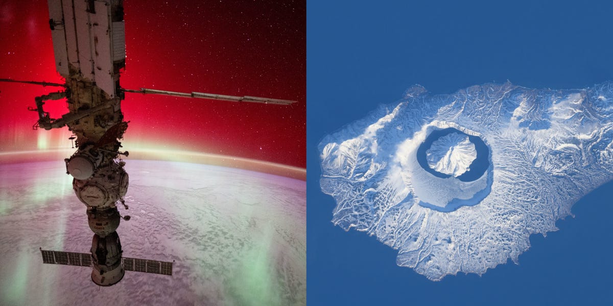 From blue comets and pink northern lights to snowy volcanos and winding rivers, the view 250 miles above Earth does not disappoint.