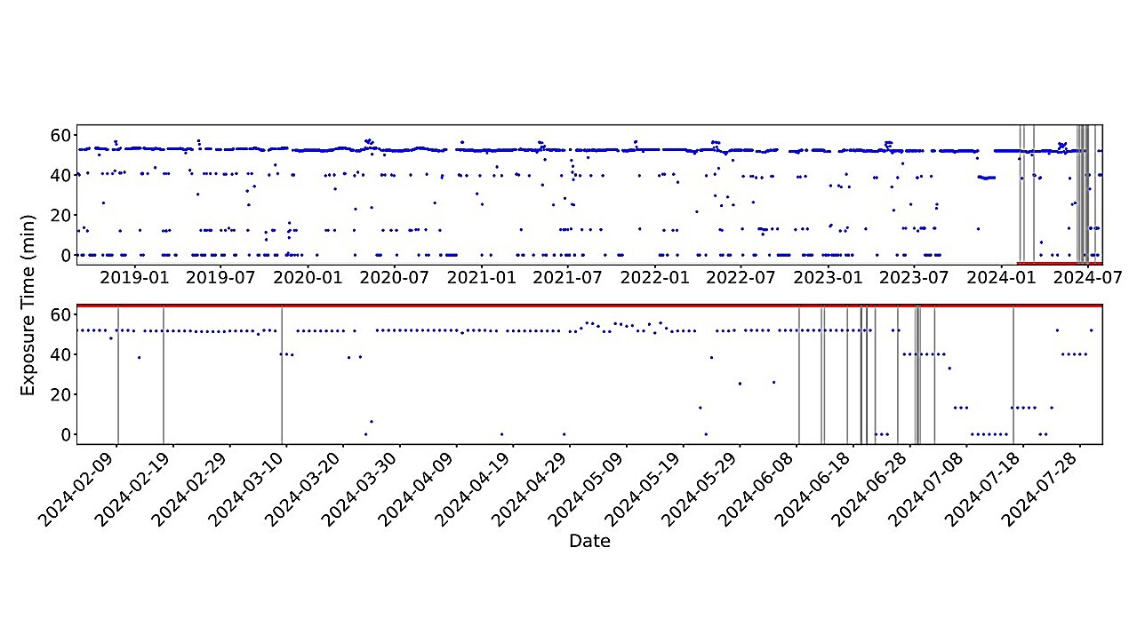 Total daily exposure time (UTC and topocentric at CHIME near Penticton, Canada) at the position of FRB 20240209A (blue points) and detection times of the repeat bursts (gray vertical lines). Credit: Shah et al., 2024.