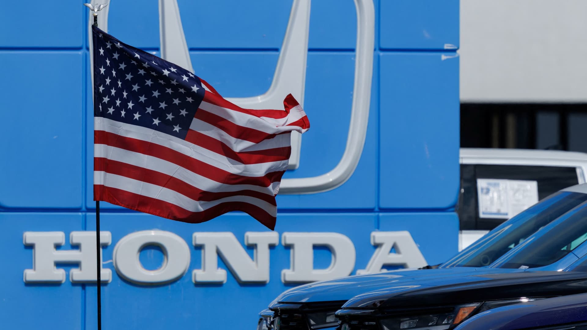 An American flag flutters outside a Honda automobile dealership in Irvine, California, U.S., March 27, 2025.