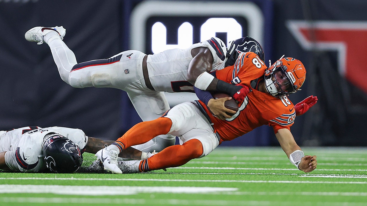 Texans linebacker Azeez Al-Shaair tackles Chicago Bears quarterback Caleb Williams at NRG Stadium in Houston on Sept. 15, 2024. (Troy Taormina-Imagn Images)