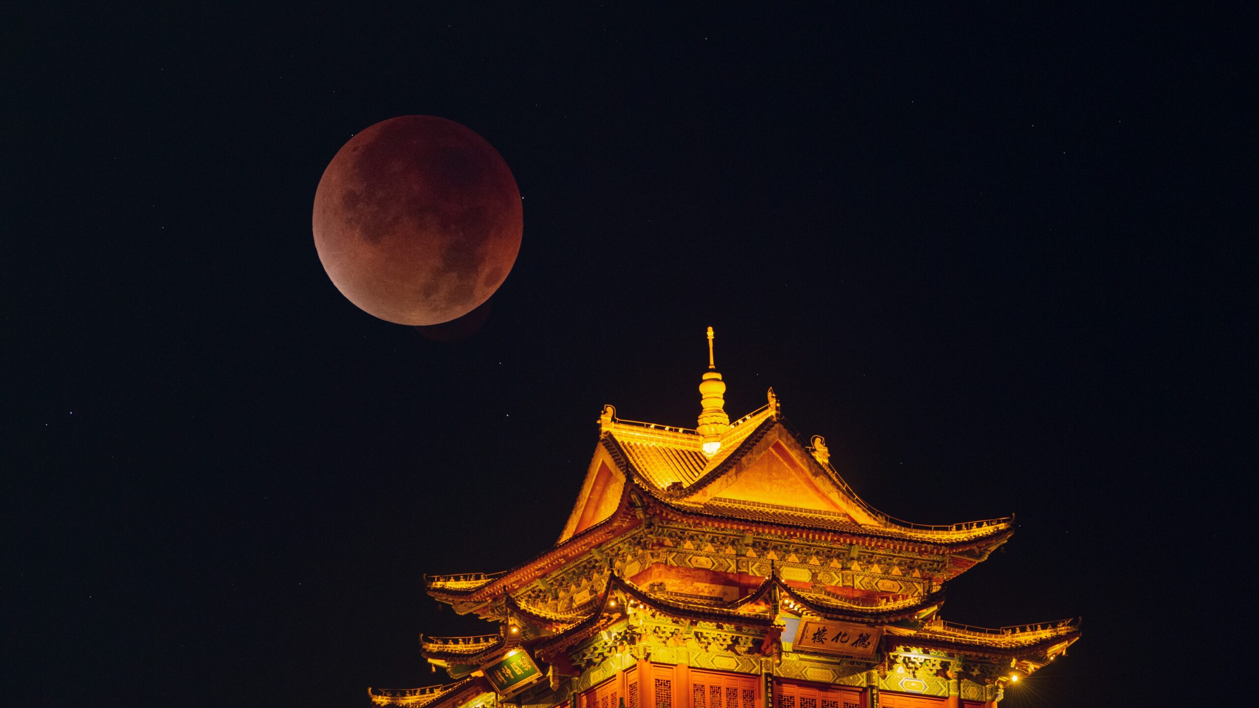A double exposure photograph of the "blood moon" above a temple in Jiujiang, China.