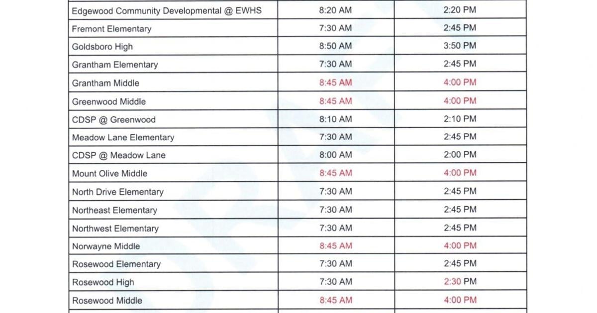 Schools impacted by the change include Brogden, Dillard, Eastern Wayne, Grantham, Greenwood, Mount Olive, Norwayne, Rosewood, and Spring Creek middle schools, Charles B Aycock, Eastern Wayne and Southern Wayne high schools, and Wayne Middle/High Academy.