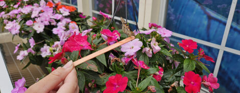 A Painted Lady butterfly is fed sweet nectar off a popsicle stick. Everyone who visits the exhibit is allowed to feed nectar to a butterfly.