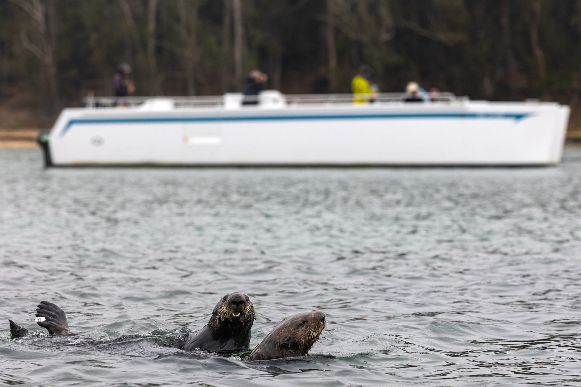 Two sea otters swim in the Elkhorn Slough National Estuarine Research Reserve near Moss Landing, California, as an electric-powered catamaran wildlife tour passes in the background on Sept. 16, 2025. (Gustavo Hernandez/KQED)