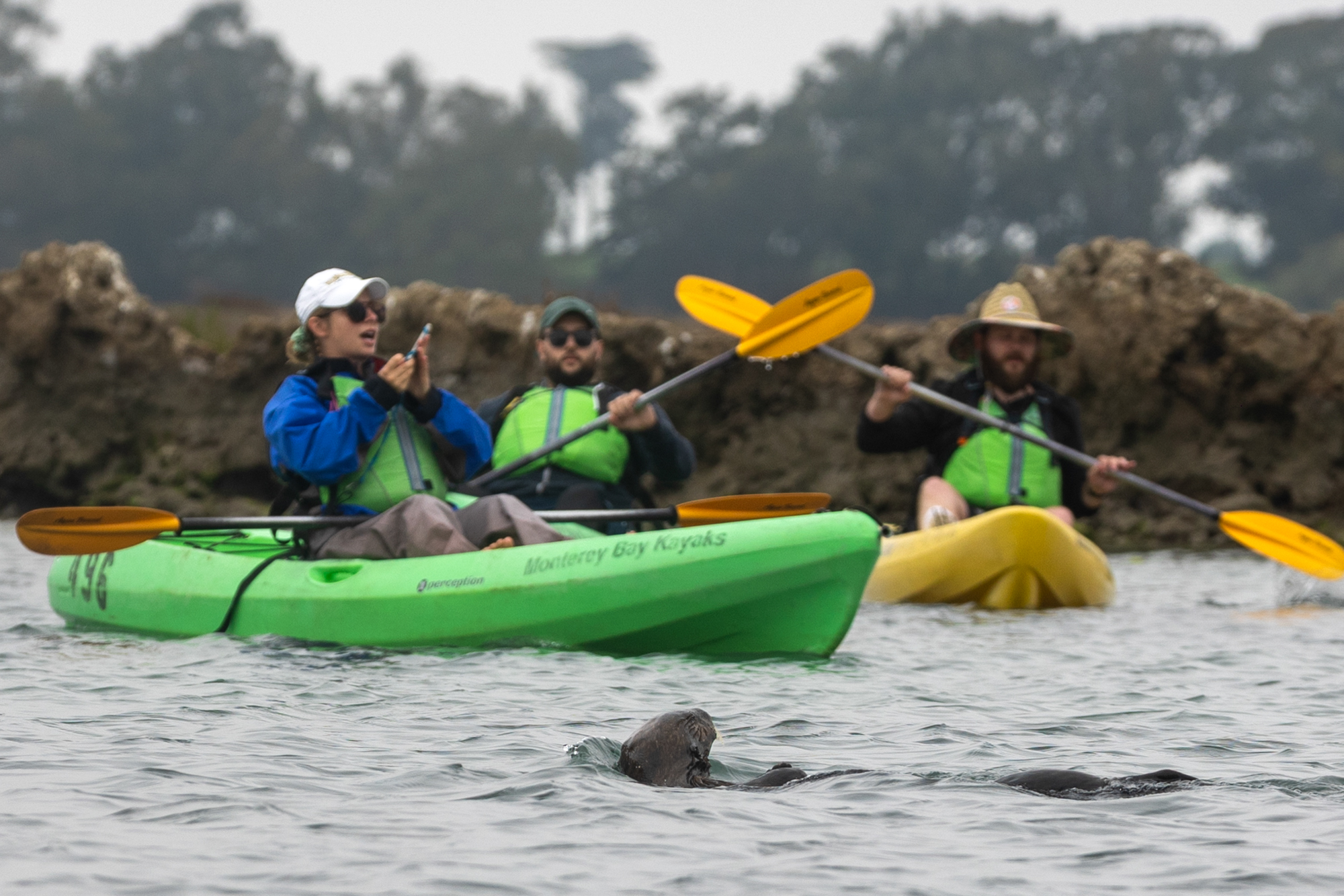 Kayakers paddle through Elkhorn Slough as a sea otter floats nearby. Conservationists warn that proposed rollbacks to Endangered Species Act protections could threaten the species’ recovery. (Gustavo Hernandez/KQED)