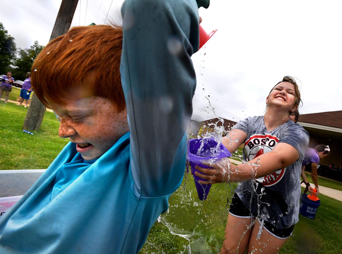 Kannon Deen-Garrett, 11, pours a small traffic cone’s-worth of water behind him for Paizley Esler, 12, to catch during a game at Camp Courage Thursday. Hendrick Health’s week-long annual workshop empowers children with skills and strategies for coping with the loss of a loved one.