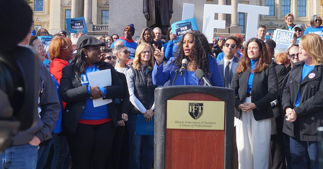 Members of the Illinois Federation of Teachers, led by union President Stacy Davis Gates, rally in front of the Statehouse in Springfield.