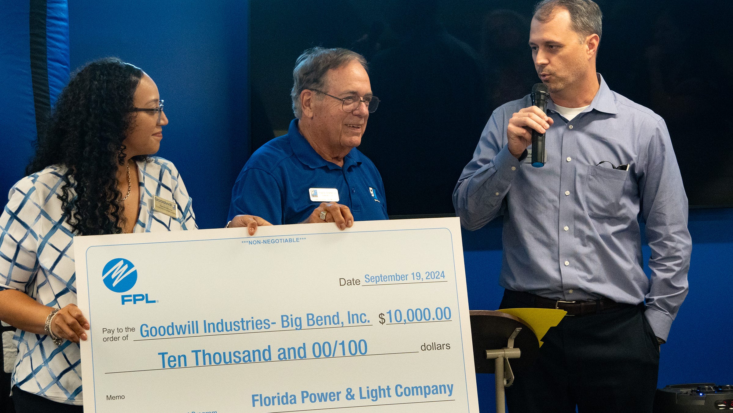 Florida Power and Light representatives provide Goodwill Big Bend with a donation of $10,000 at the grand opening of the Goodwill Career Resource Center on Sept. 19.