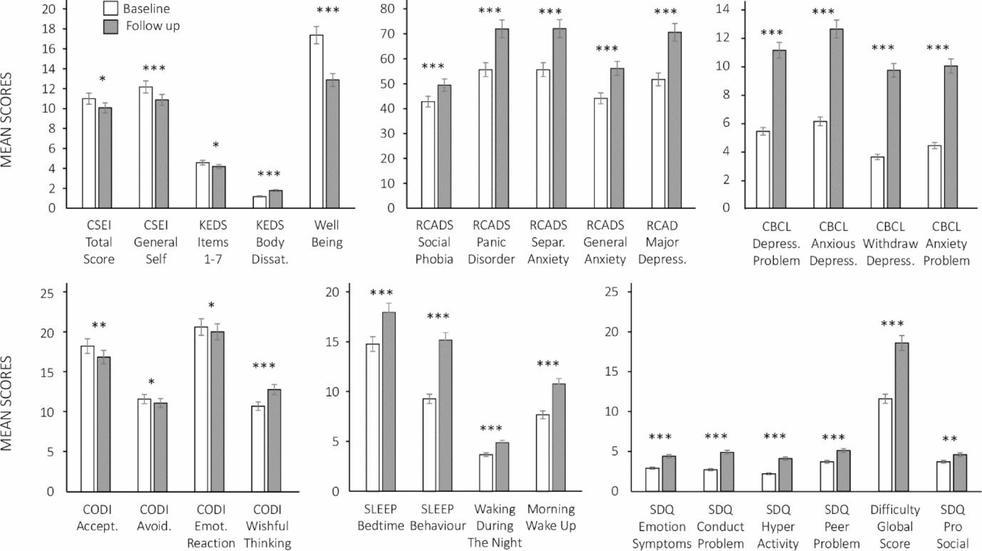 Child measures at Baseline (in white) and Follow-up (in grey). Bars represent means and standard errors. The graph at the top left shows CSEI total, CSEI general, KEDS 1–7 items, KEDS body satisfaction, and child well-being. The top middle graph shows RCADS subscales. The top right graph shows CBCL subscales. The graph at the bottom left shows CODI subscales. The bottom middle graph shows sleep habits subscales. The bottom righ graph shows SDQ subscales. All the results are significant with *p < .05, **p < .01, ***p < .001