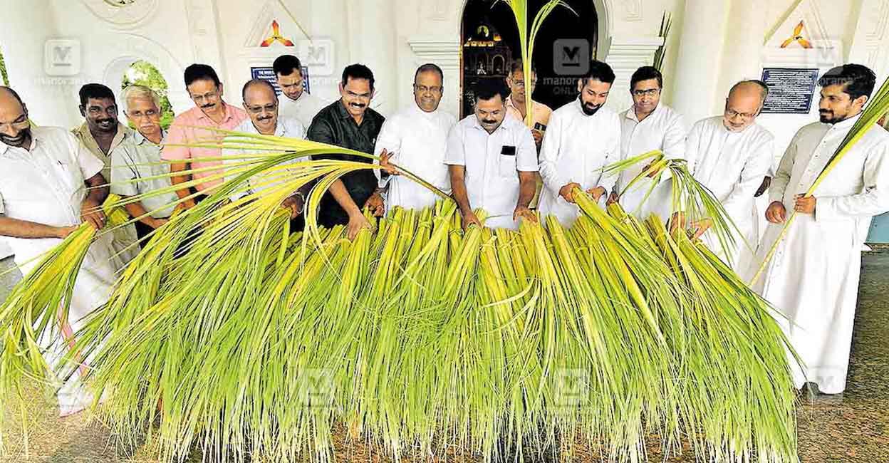 Palm fronds for distribution on Palm Sunday being prepared under the supervision of Archpriest Fr Dr Thomas Menachery at the Major Archiepiscopal Martha Mariam Archdeacon’s pilgrimage church, in Kuravilangad. Photo: Manorama
