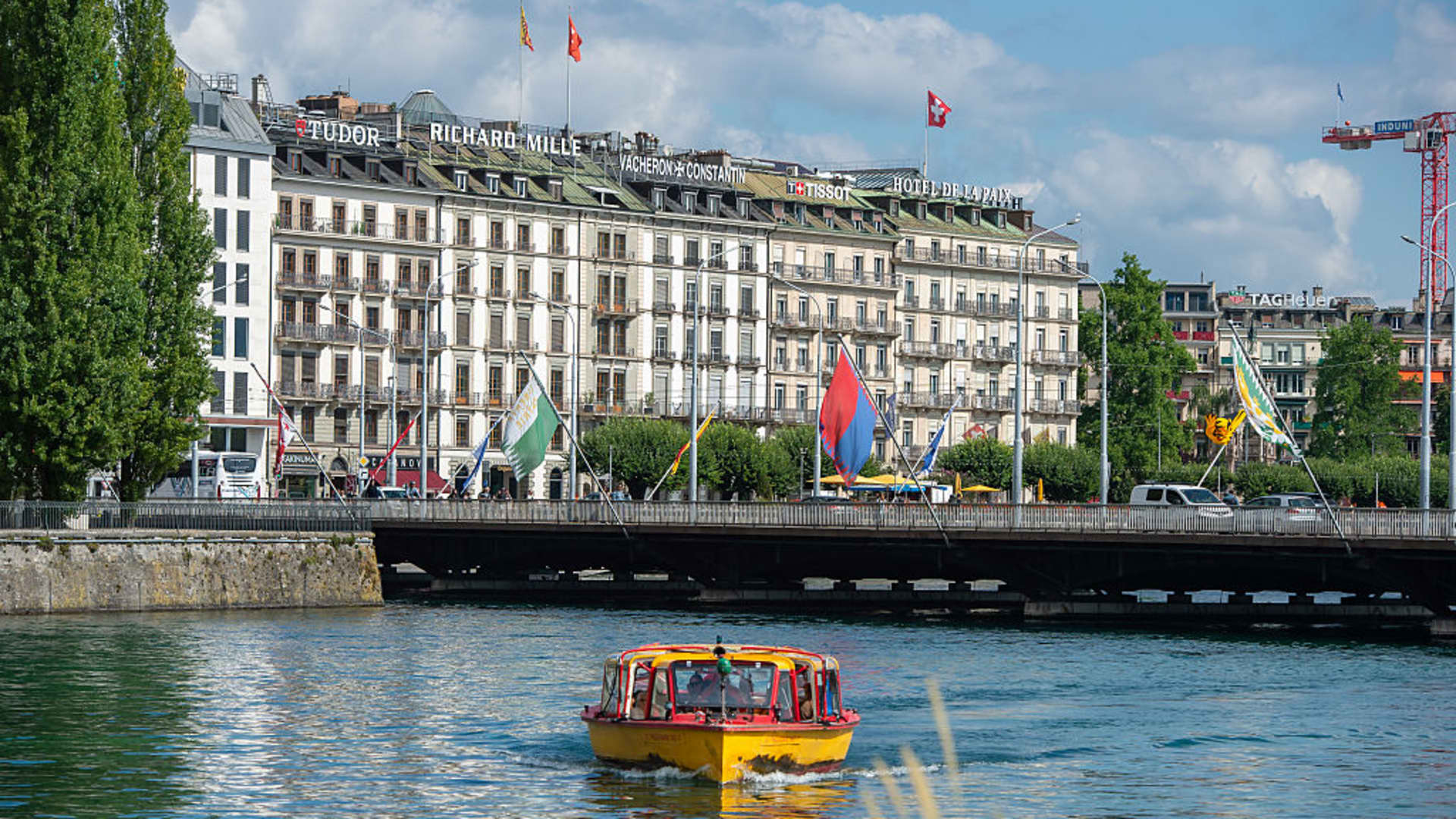 A Rolls Royce driving past the entrance of the Jaeger-LeCoultre boutique on Rue du Rhône on August 2, 2025 in Geneva, Switzerland.