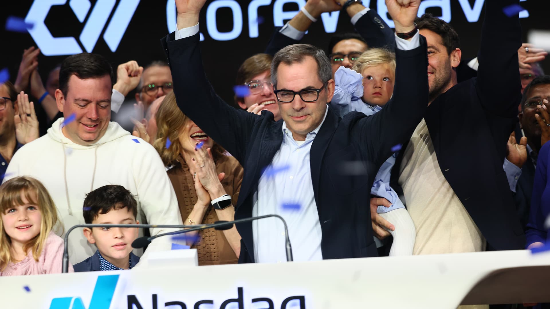 Mike Intrator, Chief Executive Officer and founder of CoreWeave, (C) celebrates after ringing the opening bell surrounded by Executive Leadership and family during the company’s Initial Public Offering (IPO) at the Nasdaq headquarters on March 28, 2025 in New York City.