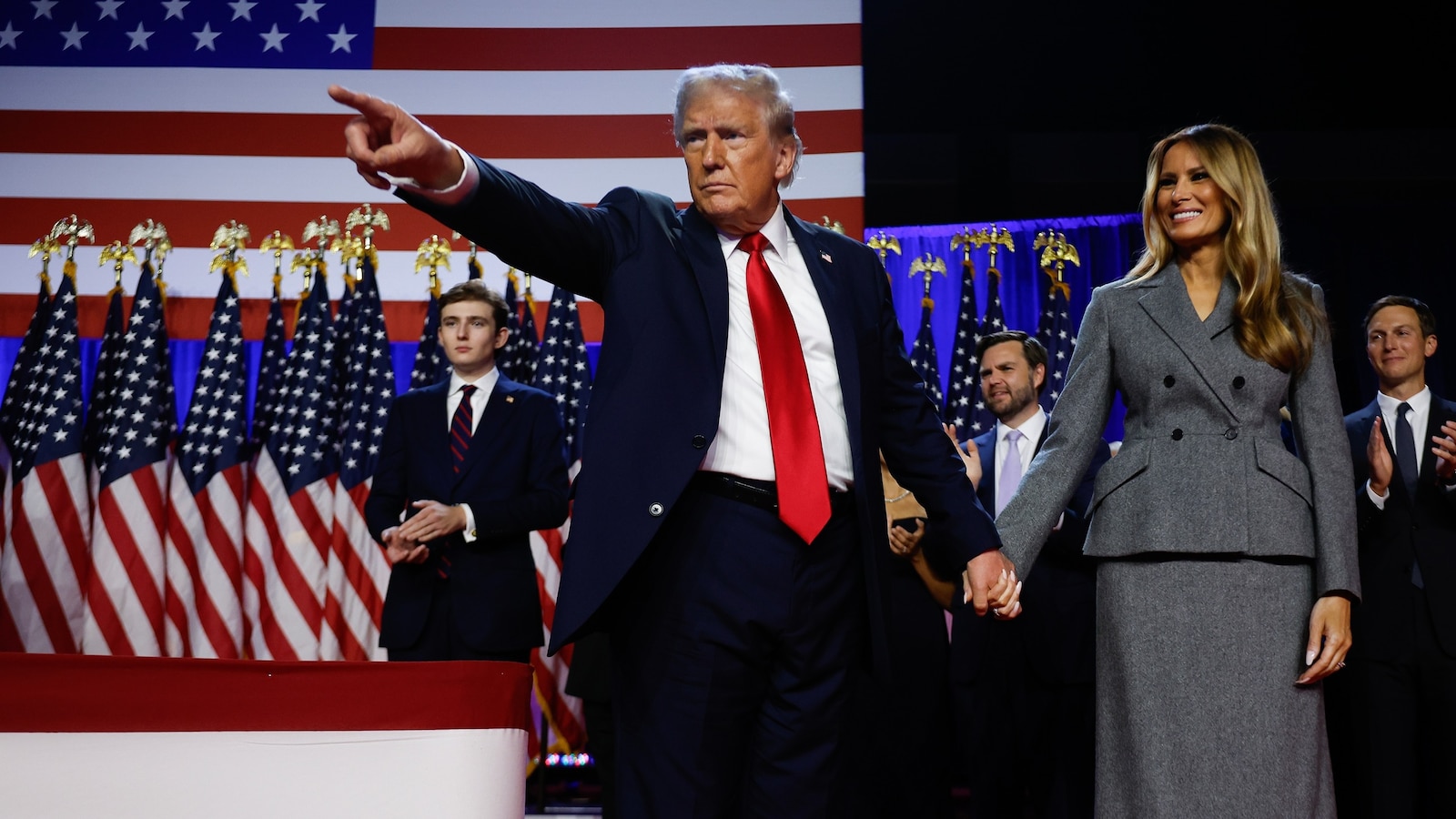 Republican presidential nominee, former U.S. President Donald Trump points to supporters with former first lady Melania Trump during an election night event, Nov.6, 2024, in West Palm Beach, Florida.