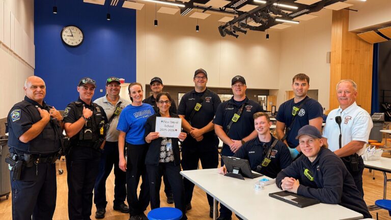 Ashland first responders posing with David Mindess school nurses after treating 39 students who were stung by a swarm of bees on the first day of school. Ashland Fire Department