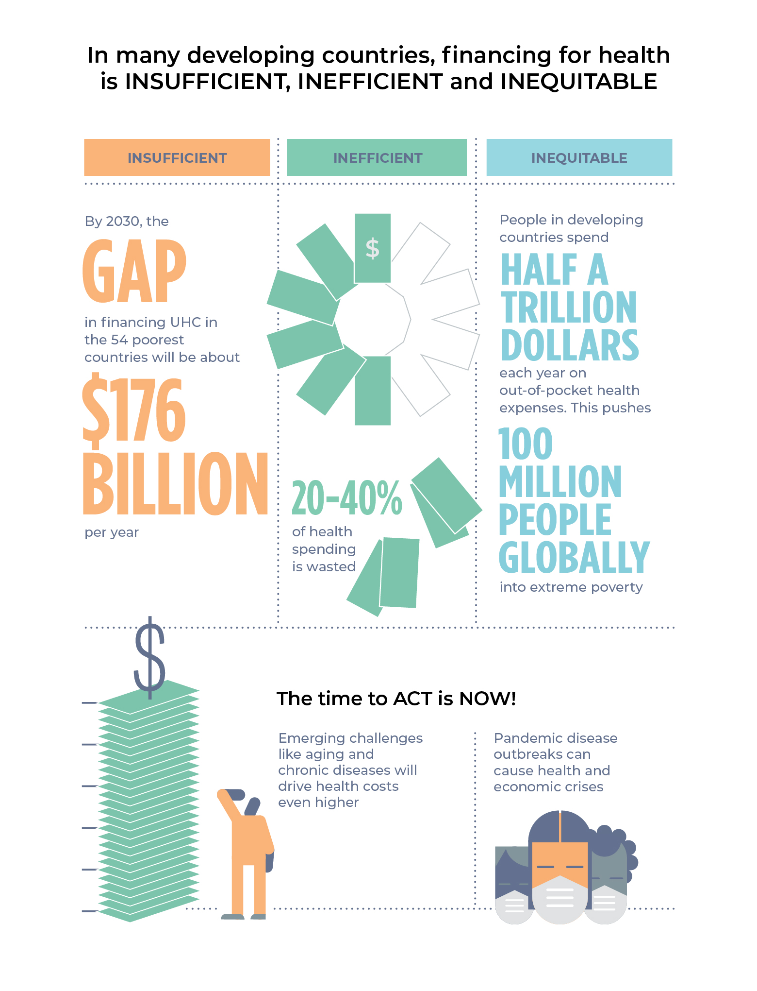 Just over a decade out from the SDG deadline of 2030, many developing countries are not on track to meet Universal Health Coverage (UHC) targets to ensure access to quality, affordable health services to all. People in developing countries pay over half a trillion dollars annually out-of-pocket for health services, which is pushing about 100 million people into extreme poverty each year. The evidence is strong that progress towards UHC would spur not just better health but also inclusive and sustainable economic growth, yet this report estimates that in 2030 there will be a UHC financing gap of $176 billion in the 54 poorest countries.  This  threatens decades-long progress on health, endangers countries’ long-term economic prospects, and makes them more vulnerable to pandemic risks. This report, launched to inform the first-ever G20 Finance and Health Ministers session in Osaka, Japan in June 2019, lays out an action agenda for countries and development partners to bridge the UHC financing gap, and makes a strong case for a focus on innovation in health financing over the next decade.