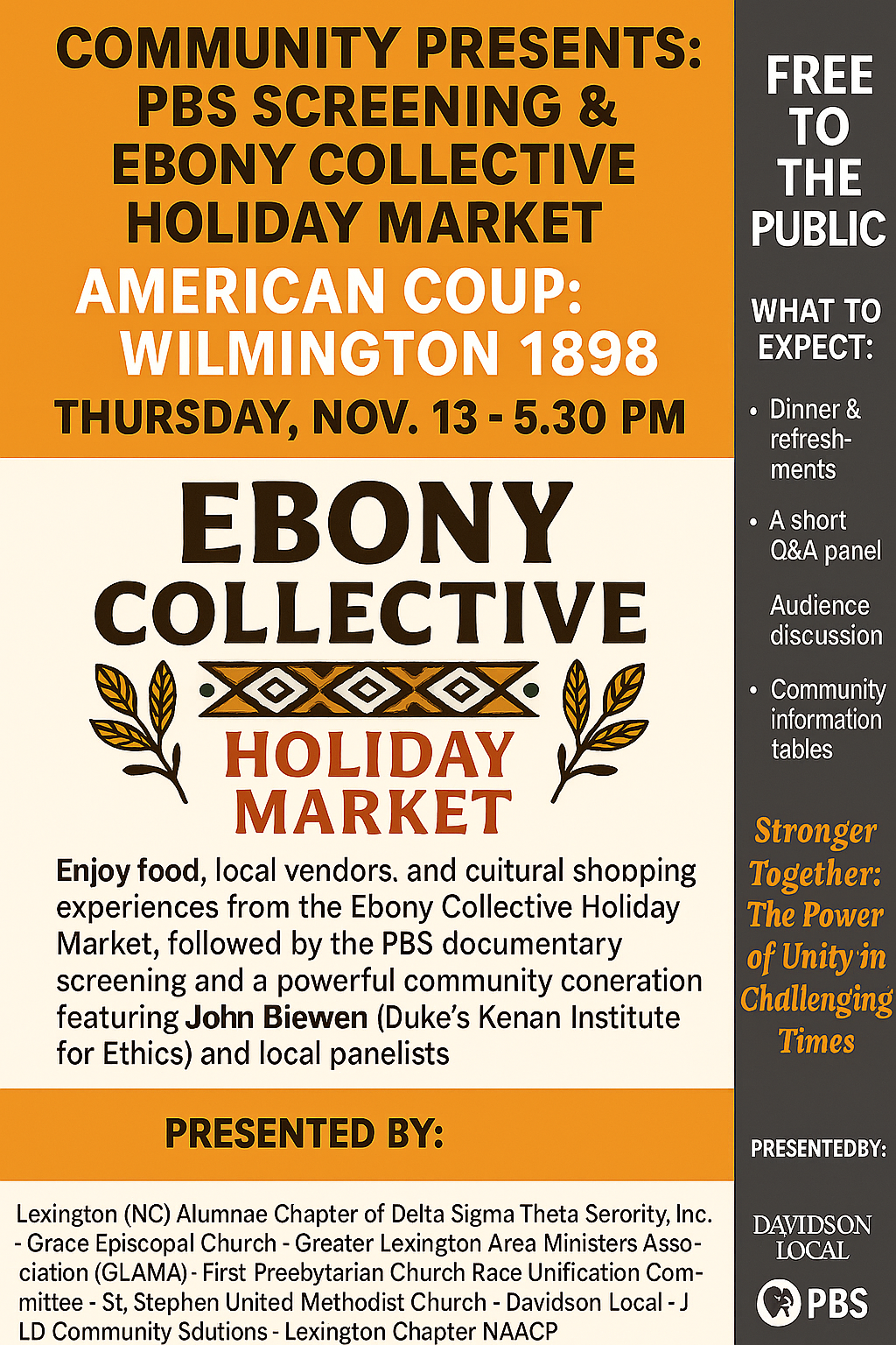 LEXINGTON, N.C. — The Edward C. Smith Civic Center will come alive with community, culture, and conversation on Thursday, November 13, when doors open at 5:00 p.m. for the Ebony Collective Holiday Market and PBS screening of American Coup: Wilmington 1898.