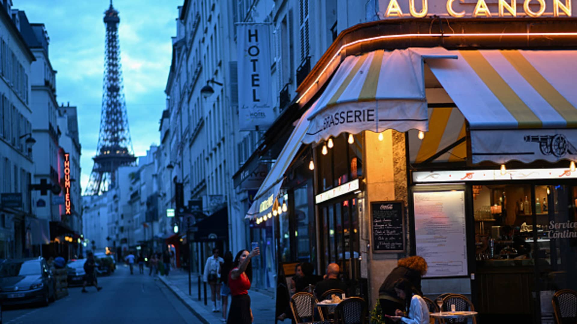 A woman takes a selfie photo, with the Eiffel Tower in the background, at Surcouf street in Paris, on July 23, 2024, ahead of the Paris 2024 Olympic Games.