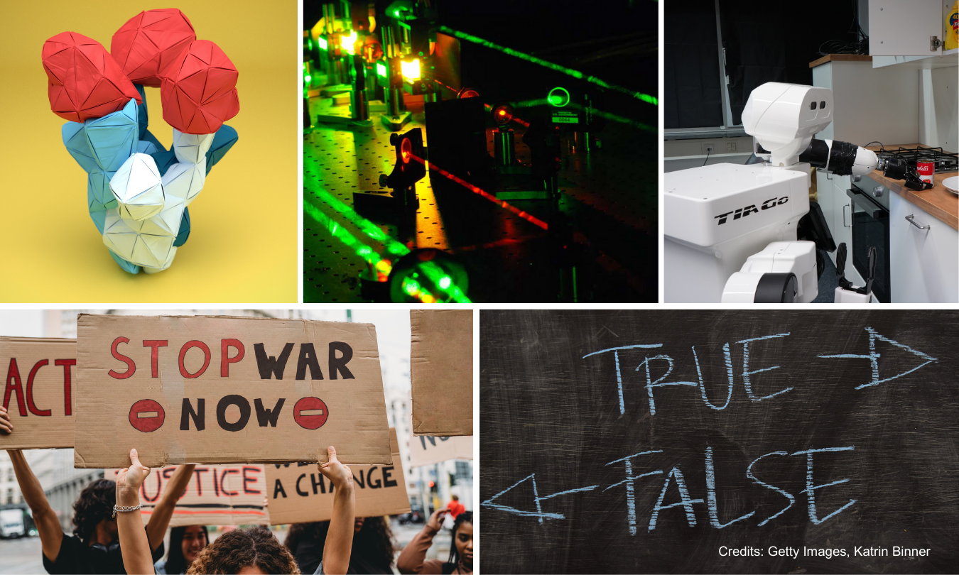 A social scientist in the Czech Republic analyses the crucial role of public opinion in military alliances; a biochemist in the UK delves into how viruses change to infect cells; a researcher in Germany explores how robots can learn to perform human-like tasks in the real world; another scientist based in Spain examines whether advanced laser techniques can help us prevent fires; and a psychologist in the Netherlands investigates (dis)information reaching teenagers.