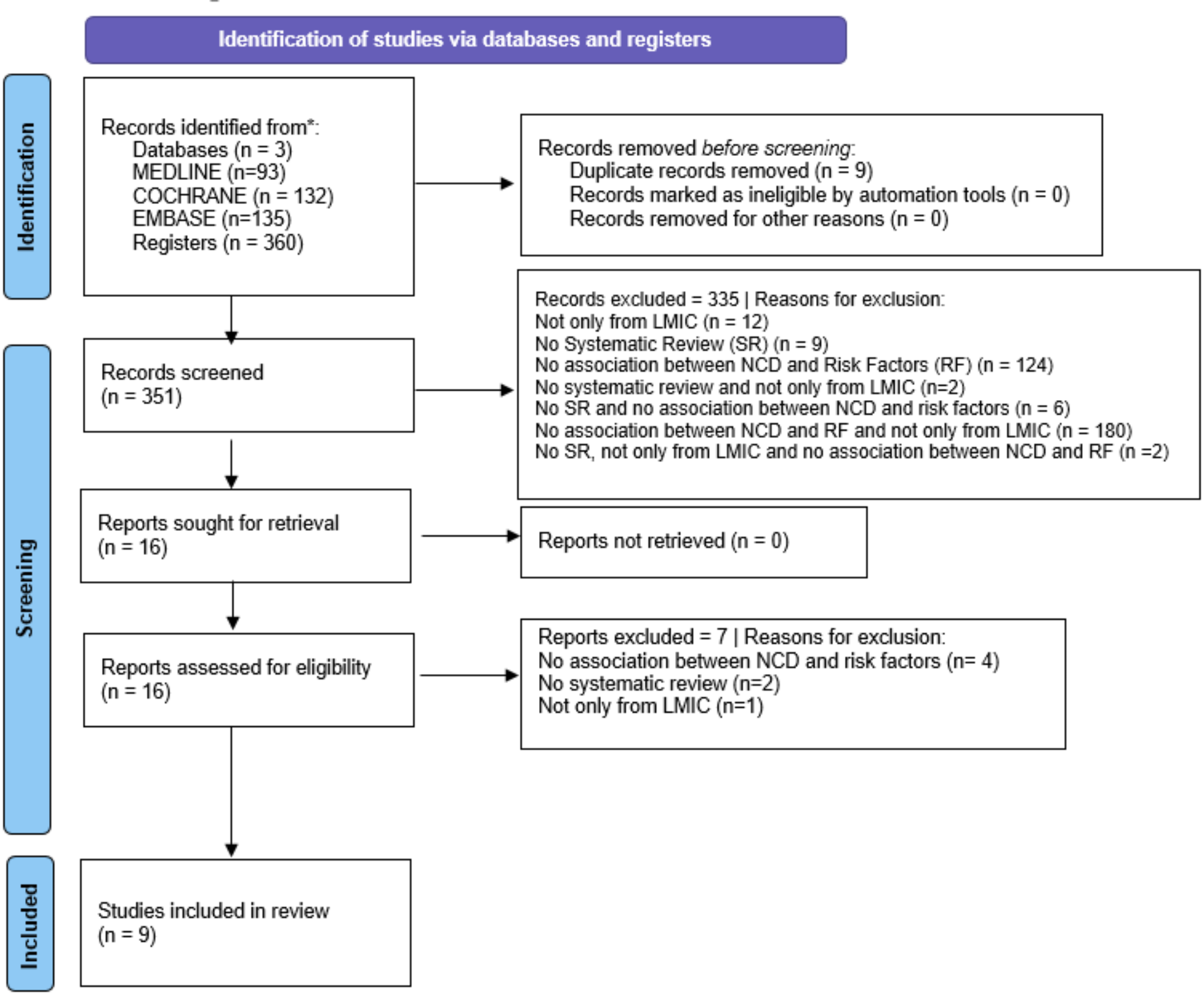 Outcome (O): Primary outcomes – evaluate the quality of writing structure, methodological conduct, reporting mode of interventions or exposures and the certainty of confidence of SRs that investigated the association of Chronic Non-Communicable Diseases (NCDs) and behavioral risk factors in LMICs according every single item of PRISMA, AMSTAR-2, TIDieR and GRADE tools. Secondary outcomes – summarize possible described effects in SR that arose from each intervention for its specific risk factor analyzed in each study, such as economic impact, reduction in hospitalizations, or improvement in well-being, quality of life, education resilience, social, physical, and occupational functioning to better understand the scenario of intervention delivered.