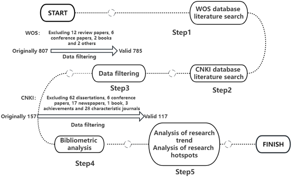 The data used in this study are from the WOS database and CNKI database. CNKI, founded in June 1999, is an authoritative academic platform in China. It is the concept of national knowledge infrastructure, which was proposed by the World Bank in 1998. CNKI project is an information construction project aimed at realizing the dissemination and sharing of knowledge resources in the whole society. CNKI has developed into an international leading online publishing platform integrating journals, doctoral theses, master’s theses, conference papers, newspapers, reference books, yearbooks, patents, standards, Chinese studies, and overseas literature resources. The daily updated literature volume of the center website is more than 50,000. The keywords retrieved from the WOS database were “climate change induced migration*,” “climate migration*,” climate resettlement*, climate refugee*, and “environmental migration*.” A total of 807 documents were retrieved, with a time span of 2008–2021. Excluding 12 review papers, six conference papers, two books and two others, and 785 valid documents in WOS database were obtained. The CNKI database searches 274 studies with the subject words “climate migration,” “climate refugee,” or “environmental migration” (Guo and Shi, 2013; Yan and Shi, 2016, 2017), and the time span was from 2008 to 2021. Excluding 62 dissertations, six conference papers, 17 newspapers, one book, three achievements and 28 characteristic journals, 157 valid documents in CNKI database were obtained.