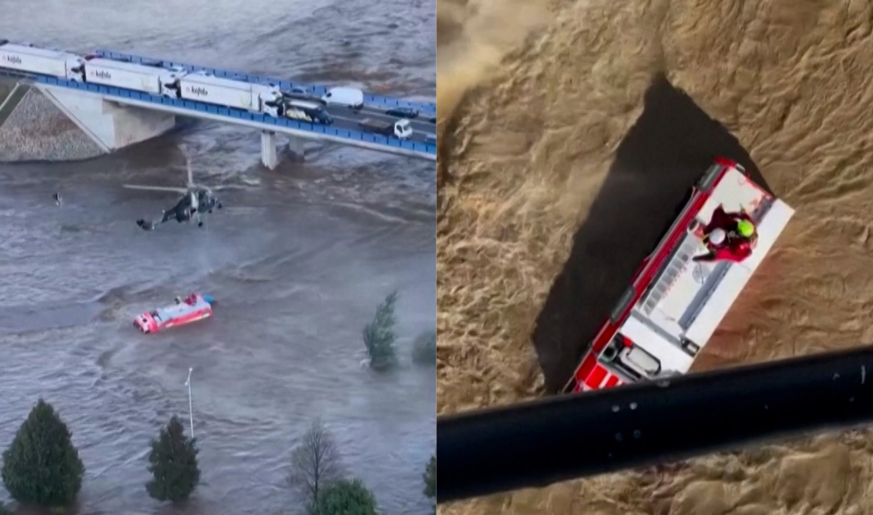 Video shows firefighters being rescued by helicopter from the roof of their fire truck after it was submerged by floodwater in the Czech Republic. The crew had been sent to help people affected by the flooding when they got stranded themselves.