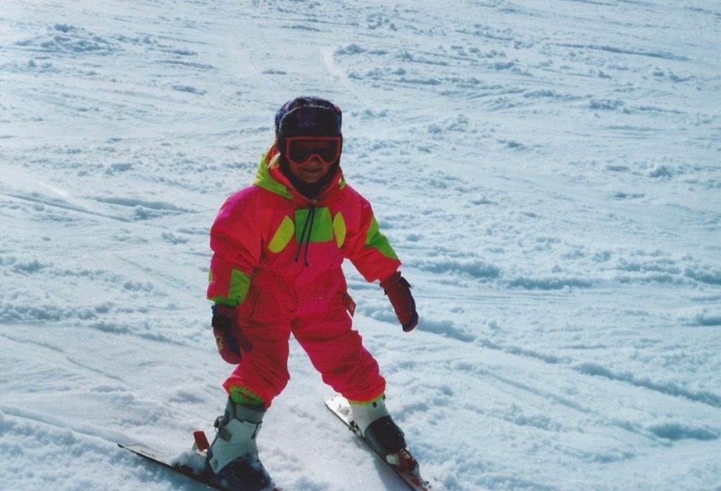 Kari Brandt at four years old in her neon onesie at Ski Green Valley in 1992.