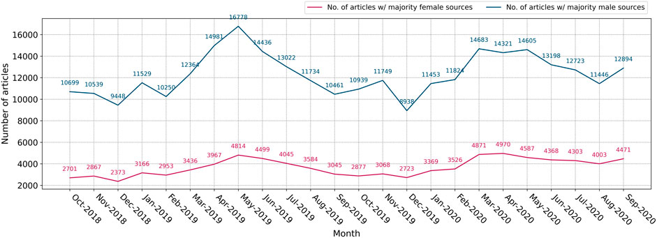 Figure 1 shows the number of articles per month with a majority of female and male sources. The number of articles that quote more men than women is roughly 3–4 times, on average, greater than the number of articles with a majority of female sources. In other words, news outlets quote men far more often than they do women, at a ratio of about 3:1, a result that has been shown in other analyses of news media (Macharia, 2015; Shor et al., 2015; Kassova, 2020a; Kassova, 2020b). Many of these sources being quoted are frequently repeated across outlets, as well as across time periods—for example, Donald Trump, the United States President during the period of analysis, and Justin Trudeau, the Canadian Prime Minister, are the most quoted men by far, appearing as sources in a large proportion of all articles that feature politics and related topics. The fact that both curves in Figure 1 tend to rise and fall together in the same months indicates that the disparity between the raw numbers of men and women quoted is a constant feature of news coverage, and not due to volume of articles or quotes on any given time period.