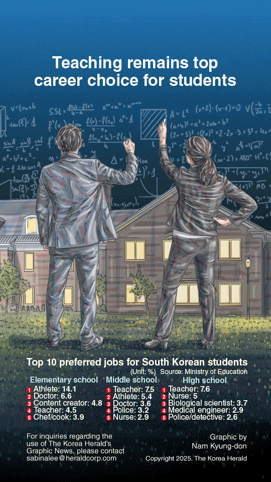 Teaching continues to be the most popular career choice among South Korean middle and high school students, despite ongoing incidents challenging teachers’ authority.