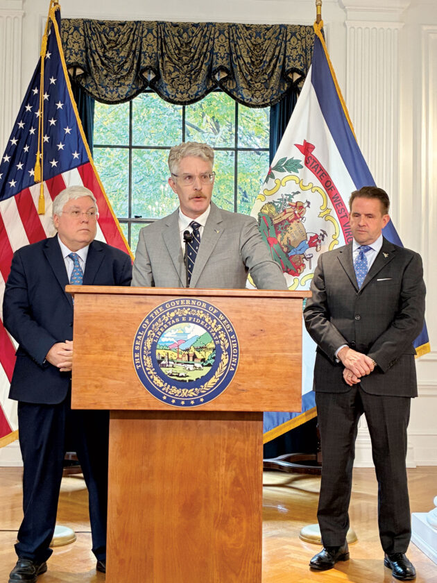 Incoming Washington Center Director Patrick Lee Miller, flanked by Gov. Patrick Morrisey, left, and WVU President Michael Benson, right, speaks at an Oct. 29 press conference welcoming him as the new center’s founding director. (Photo by Steven Allen Adams)