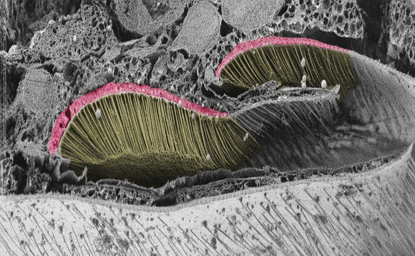 This colorized cross-section of a male mason bee’s abdomen reveals the hidden sternal gland (red) and the bristle-filled cavity (yellow) used to store and release male-repelling pheromones.