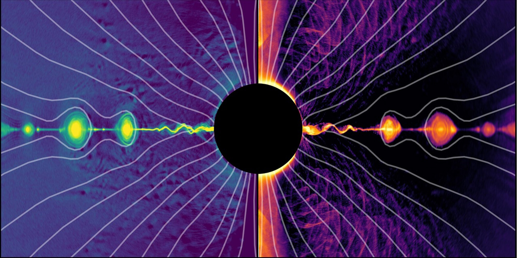 In the equatorial plane of the black hole, the researchers’ calculations revealed intense reconnection activity, leading to the formation of a chain of plasmoids—a condensation of plasma in energetic “bubbles”—moving at nearly the speed of light. According to the scientists, this process is accompanied by the generation of particles with negative energy that is used to power extreme astrophysical phenomena like jets and plasma eruptions.