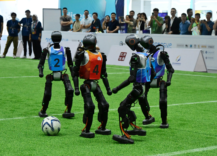 Robots compete during a soccer game at the 2025 Robot World Cup (RoboCup) Asia-Pacific Qingdao Invitational Tournament in Qingdao, Shandong Province, on September 8 (XINHUA)