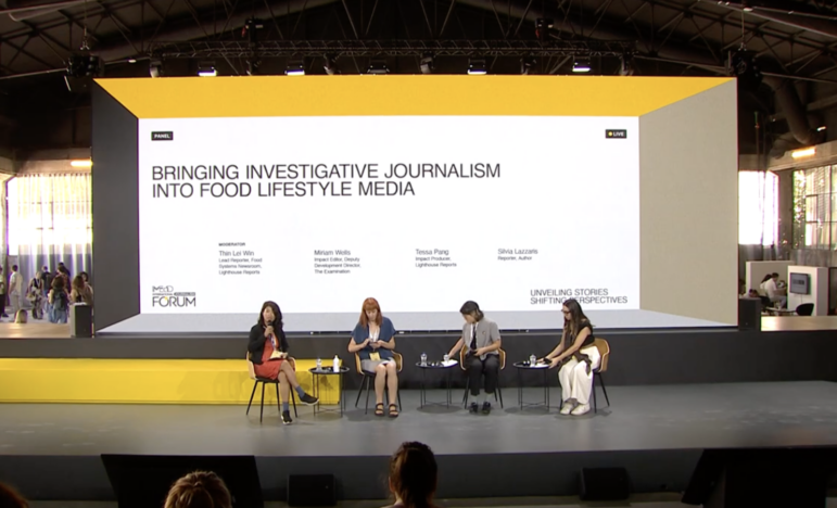 Thin Lei Win invited the panelists — Tessa Pang, impact producer for Lighthouse Reports; Miriam Wells, impact editor and deputy director at The Examination; and Silvia Lazzaris, science reporter and author — to share how they made more impact with food investigations, such as finding creative angles to dry topics, innovative social media campaigns, and finding partners for reaching audiences outside the investigative beat.