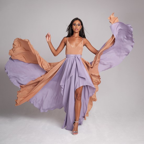 The HEROINE Collection: Sculptural, gravity-defying pieces that blend fluid movement with meticulous structure. The standout piece, a nude and lavender silk gown, was a striking example of IMAATU’s ability to merge elegance with architectural precision.