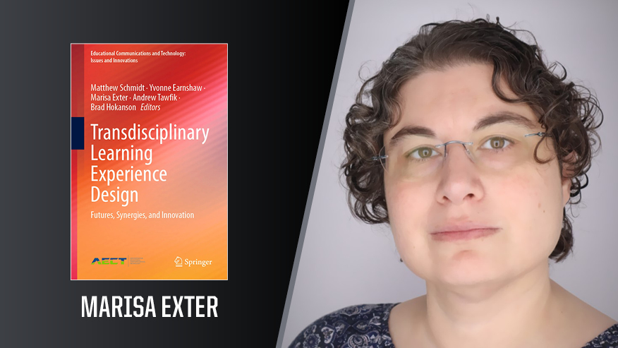 Marisa Exter, associate professor of learning design and technology, and her published book “Transdisciplinary Learning Experience Design: Futures, Synergies, and Innovation.”