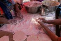 Workers knead dough during Indigenous Peoples’ Day Fair on Oct. 14 on the Central Library mall. Various workers knead frybread dough for events such as powwows.