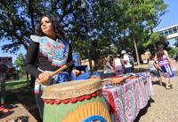 Dallas resident Natalie Quiroz drums at Indigenous Peoples’ Day Fair on Oct. 14 on the Central Library mall. Quiroz is part of the Ollin Cuauhtli Mexica Danza group.
