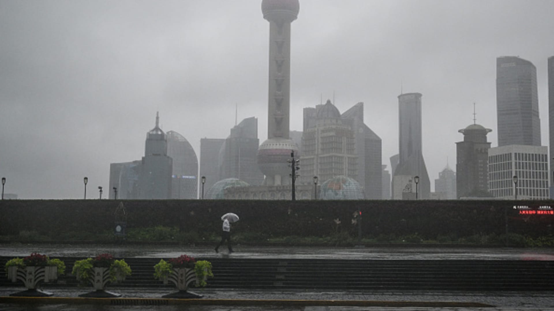 A man walks along The Bund during the passage of Typhoon Bebinca in Shanghai on September 16, 2024. The strongest storm to hit Shanghai in over 70 years made landfall on September 16, state media reported, with flights cancelled and highways closed as Typhoon Bebinca lashed the city with strong winds and torrential rains.