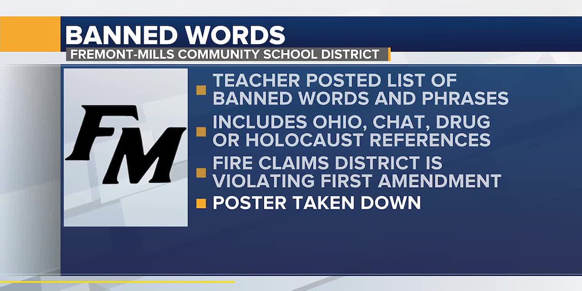 A Fremont-Mills School District teacher posted a list of almost 30 banned words and phrases in the classroom, including seemingly ordinary words like “Ohio” and “chat.”
