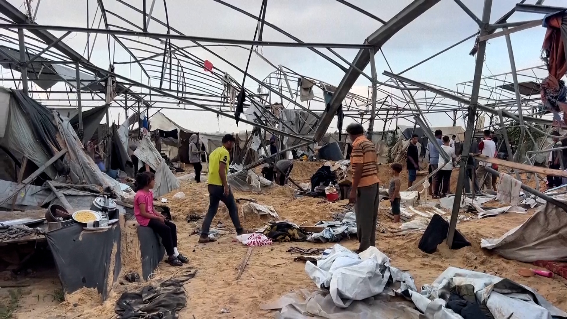 Share Facebook Twitter LinkedIn Pinterest Email An Israeli airstrike hit tents sheltering displaced Palestinians in al-Mawasi, Gaza, a so-called safe zone.