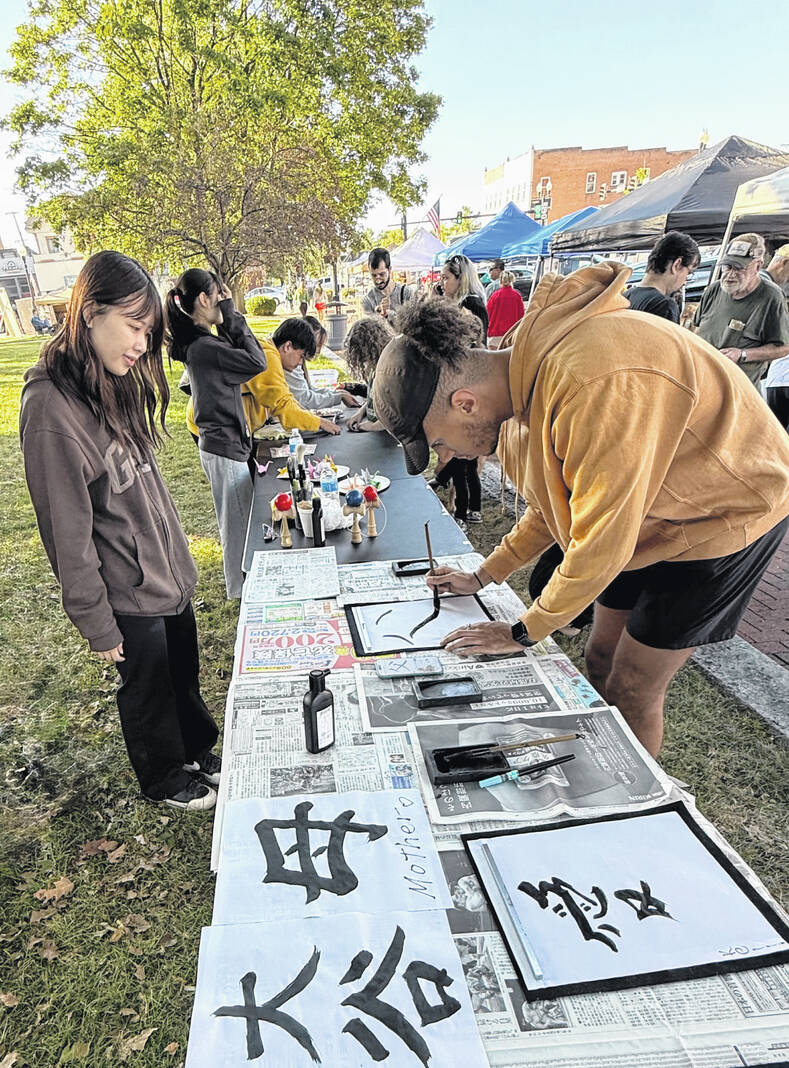 SIDNEY — The Great Sidney Farmer’s Market had an international flair Saturday morning. Several Japanese students attending the University of Findlay invited those attending the market to try their skills at calligraphy, origami, kendama, daruma otoshi and a fish catching game.