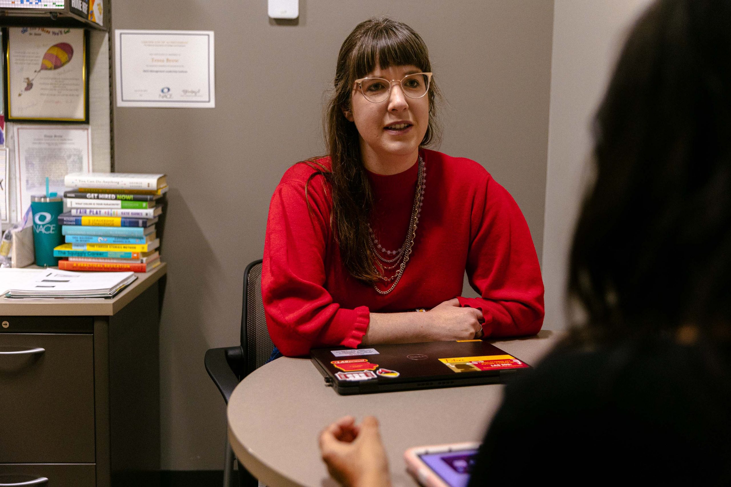 Tessa Brow with LAS Career Services speaks to a student in her office.