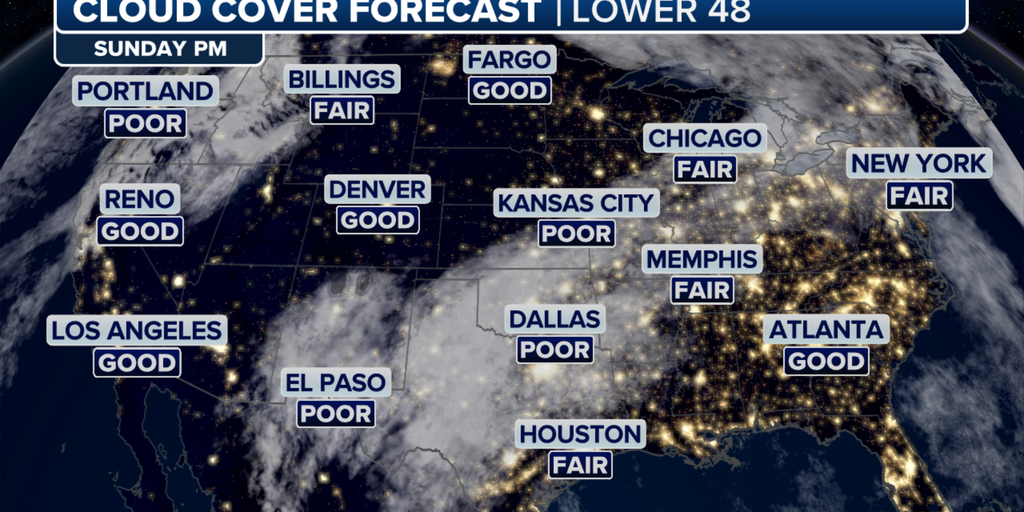 According to the FOX Forecast Center, the Southeast, Mid-Atlantic, parts of the Southwest and Northern Plains will have good viewing conditions with minimal cloud cover.